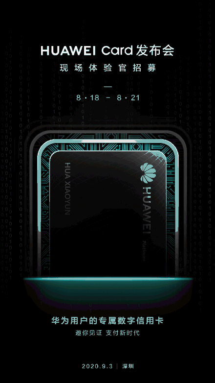 华为将于 9 月 3 日举行数字信用卡 Huawei Card 发布会。本年 4 月,华为在 P40 系列国行发布会上推出了相似 Apple Card 的数字银行卡 Huawei Card。该卡是华为携手银联、协作银行一起打造的数字银行卡产品,兼具数字、实体双卡特点,高度集成银联手机闪付 Huawei Pay 付出服务。持卡人能够经过银联境内、境外的全球受理网络,在线上、线下运用该卡。